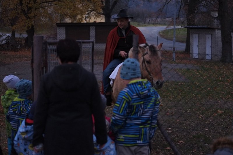 V pondělí 12.11.2018 se sešli před MŠ děti s rodiči. Děti měly kostýmy koníků a lampionky. Krátce jsme si něco pověděli o Martinovi, ochutnali jsme Martinské rohlíčky a šli jsme hledat stříbrné podkovičky. Ty nás zavedly na výletiště, kde na nás čekal Martin na koni. Ten nám pověděl pověst o svatém Martinovi a vedl nás ulicemi vesnice až ke školce. Tam jsme se rozloučili. Vycházka se nám moc líbila. Děti druhý den nakreslily krásné obrázky.