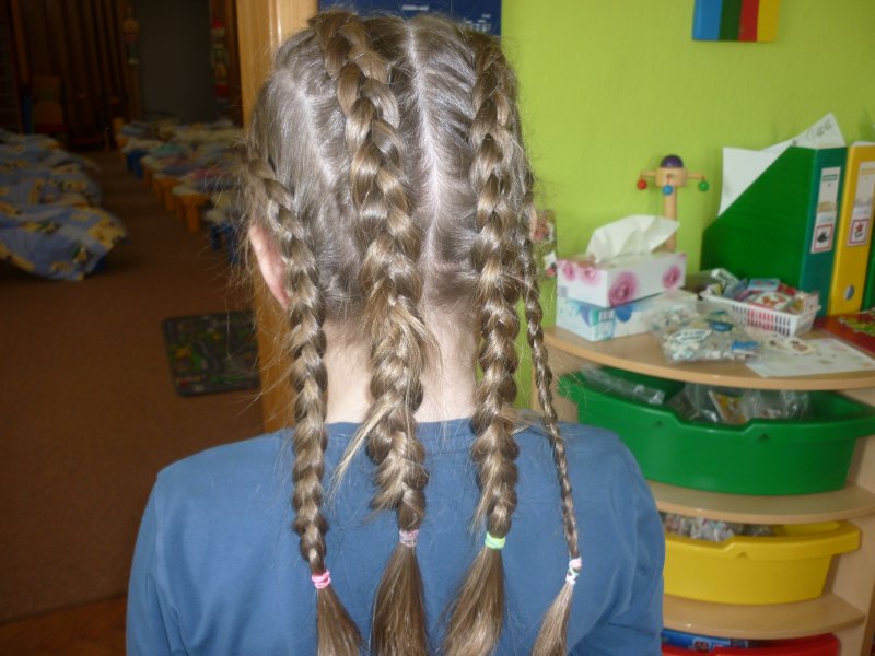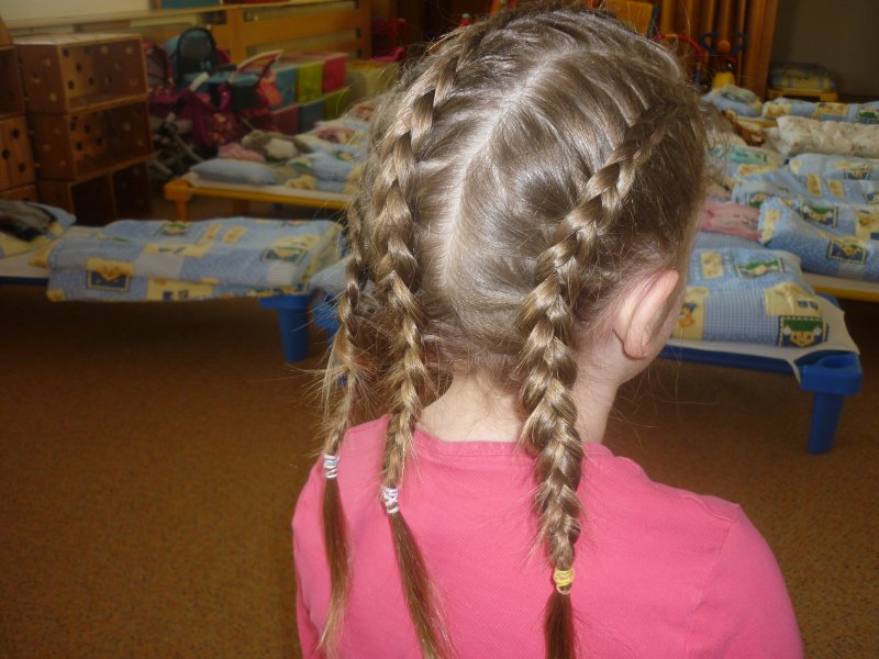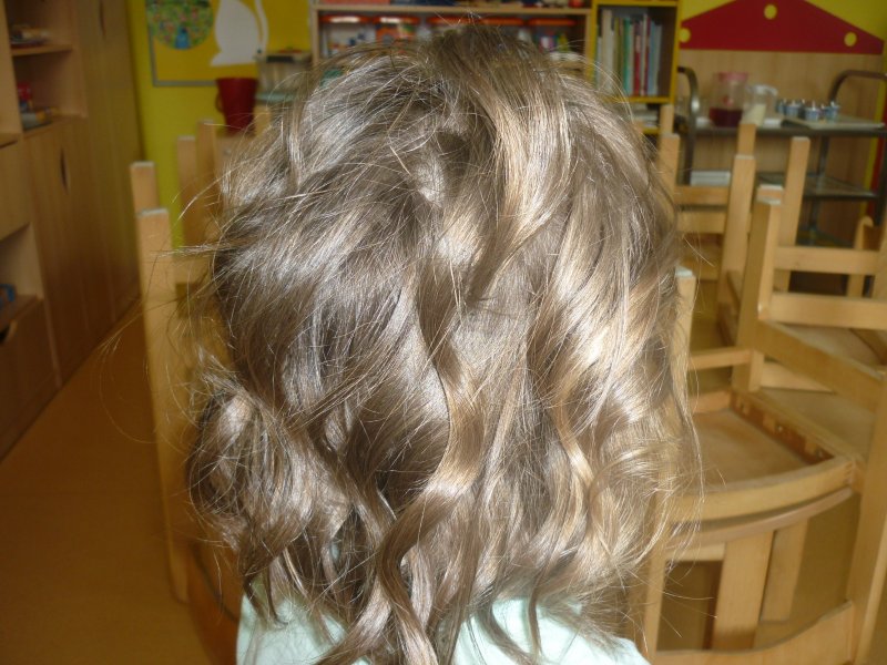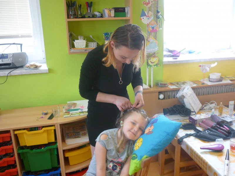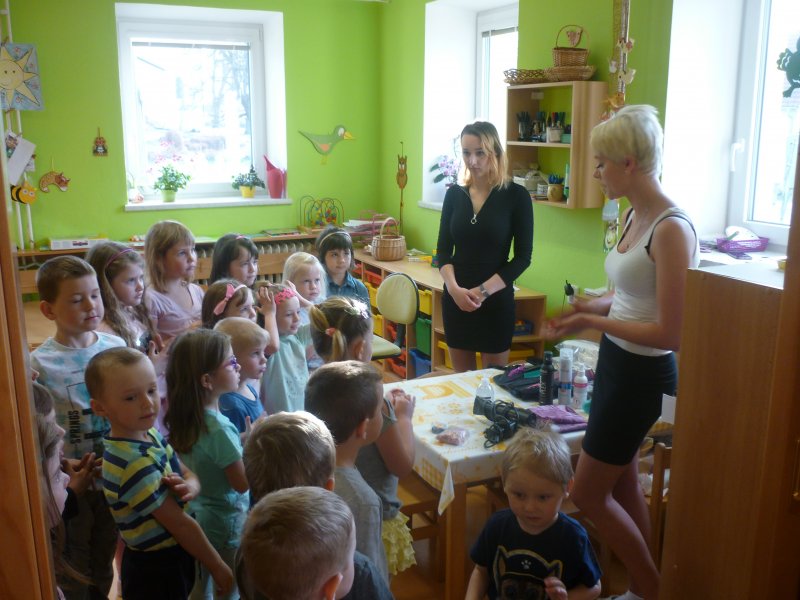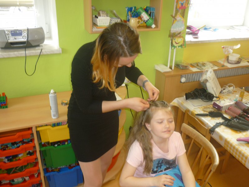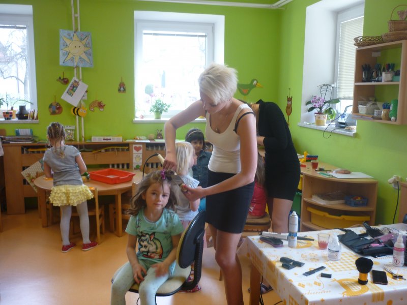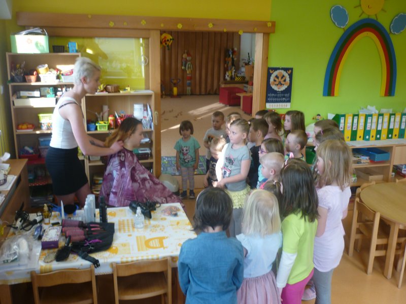 Holky i kluci byli natěšeni. Kadeřnice se pustily do práce a začaly jim dělat různě účesy na přání. Některé holky si nechaly vlasy natočit, jiné zase zaplést copánky. Musíme samozřejmě, říci, že se našli i odvážlivci na stříhání (po dohodě s maminkami). Moc to všem slušelo, škoda jen, že bylo tak málo času na tolik dětí, paní kadeřnice by si jistě vyhrály i s některými účesy víc. Děti to opravdu moc bavilo a byly pozornými posluchači a diváky.