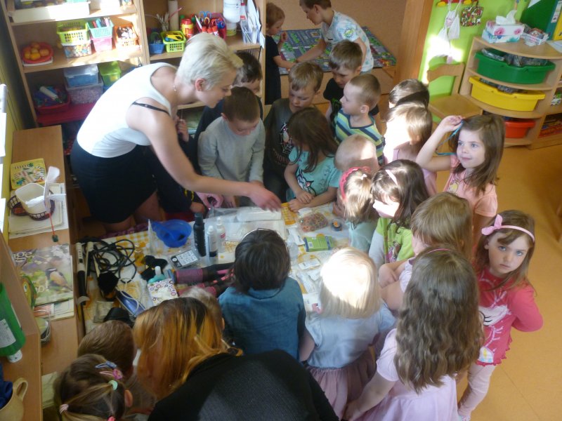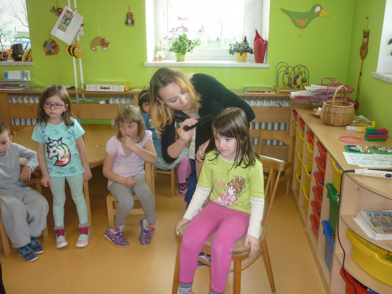 V prvním dubnovém týdnu jsme u nás ve škole přivítali paní kadeřnice: Terezu Koskovou a Natalii Crhonkovou. Děti seznámily s různými pomůckami, které se nejčastěji používají v kadeřnictví a také s lékárničkou, která je nezbytnou součástí každého kadeřnictví. Ukázaly dětem různé kartáče, hřebeny, nůžky, kulmy, fény, žehličky, všelijaké sponky, pinetky atd…