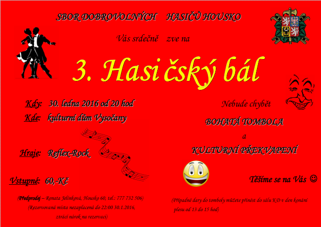 Vstupné: 60,- Kč (Předprodej: Renata Jelínková, Housko 60, tel.:777 732 506; rezervovaná místa nezaplacená do 22:00 30.1.2016 ztrácí nárok na rezervaci)