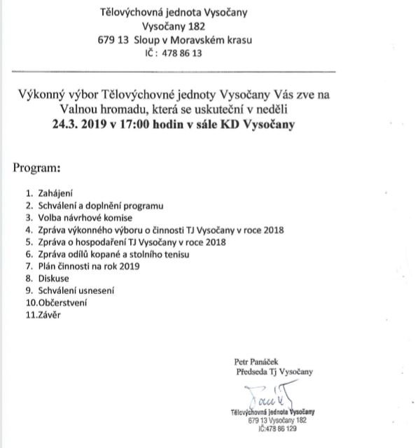 Výkonný výbor Tělovýchovné jednoty Vysočany zve své členy na Valnou hromadu, která se uskuteční v neděli 24. 3. 2019 od 17:00 hodin v sále KD Vysočany.
