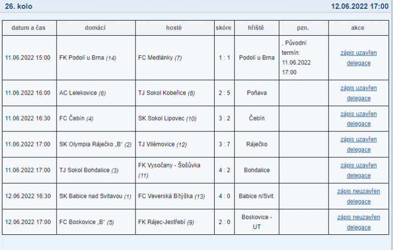 26. kolo krajské 1.B. třídy - 11. 6. 2022